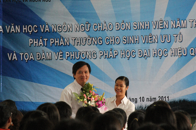 Sáng ngày 08/10, chương trình chính thức diễn ra tại phòng C103, cơ sở Đinh Tiên Hoàng. Ngoài số lượng sinh viên năm nhất, về dự chương trình còn có PGS.TS. Đoàn Lê Giang – Trưởng Khoa, TS. Nguyễn Ngọc Quận – Phó Trưởng Khoa, TS. Nguyễn Hữu Hiếu – Trưởng bộ môn Văn học Nước ngoài và Văn học So Sánh, TS. Võ Văn Nhơn – GV bộ môn Văn học Việt Nam. Đại diện cho BCN Khoa, PGS. TS. Đoàn Lê Giang đã phát biểu chào mừng các bạn tân sinh viên. Những lời khuyên bổ ích và thiết thực của thầy đã giúp các bạn tân sinh viên có một định hướng vững chắc cho bốn năm Đại học. Ngoài ra, trong buổi sáng, BCN còn trao các phần quà cho các bạn Thủ khoa đầu vào, Thủ khoa tốt nghiệp đầu ra, SV có thành tích NCKH xuất sắc, SV sáng tác tiêu biểu và cán bộ Đoàn – Hội hoạt động tốt. Đây là những gương mặt điển hình, đại diện cho sức mạnh và vị thế của Khoa Văn học & Ngôn ngữ trên nhiều phương diện khác nhau.