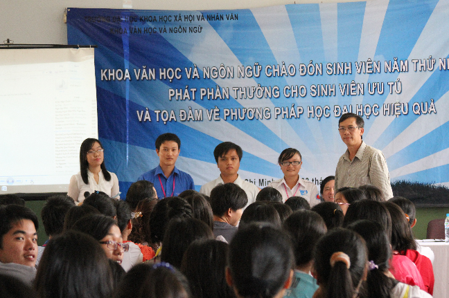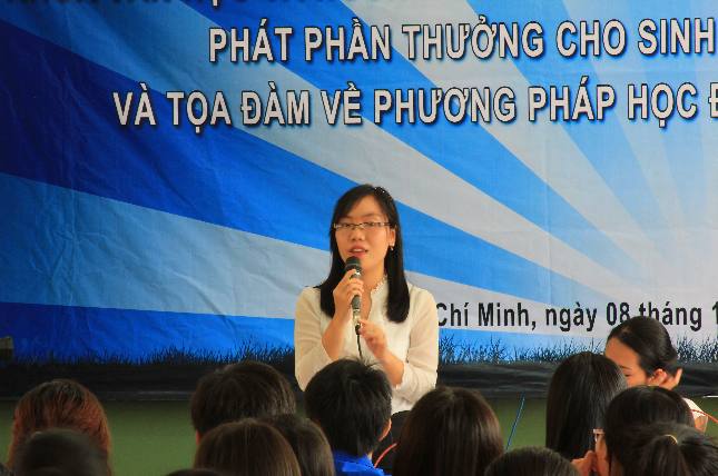 (Ảnh 4: ThS. Ngô Trà Mi trao đổi với sinh viên năm nhất về Phương pháp học đại học hiệu quả)